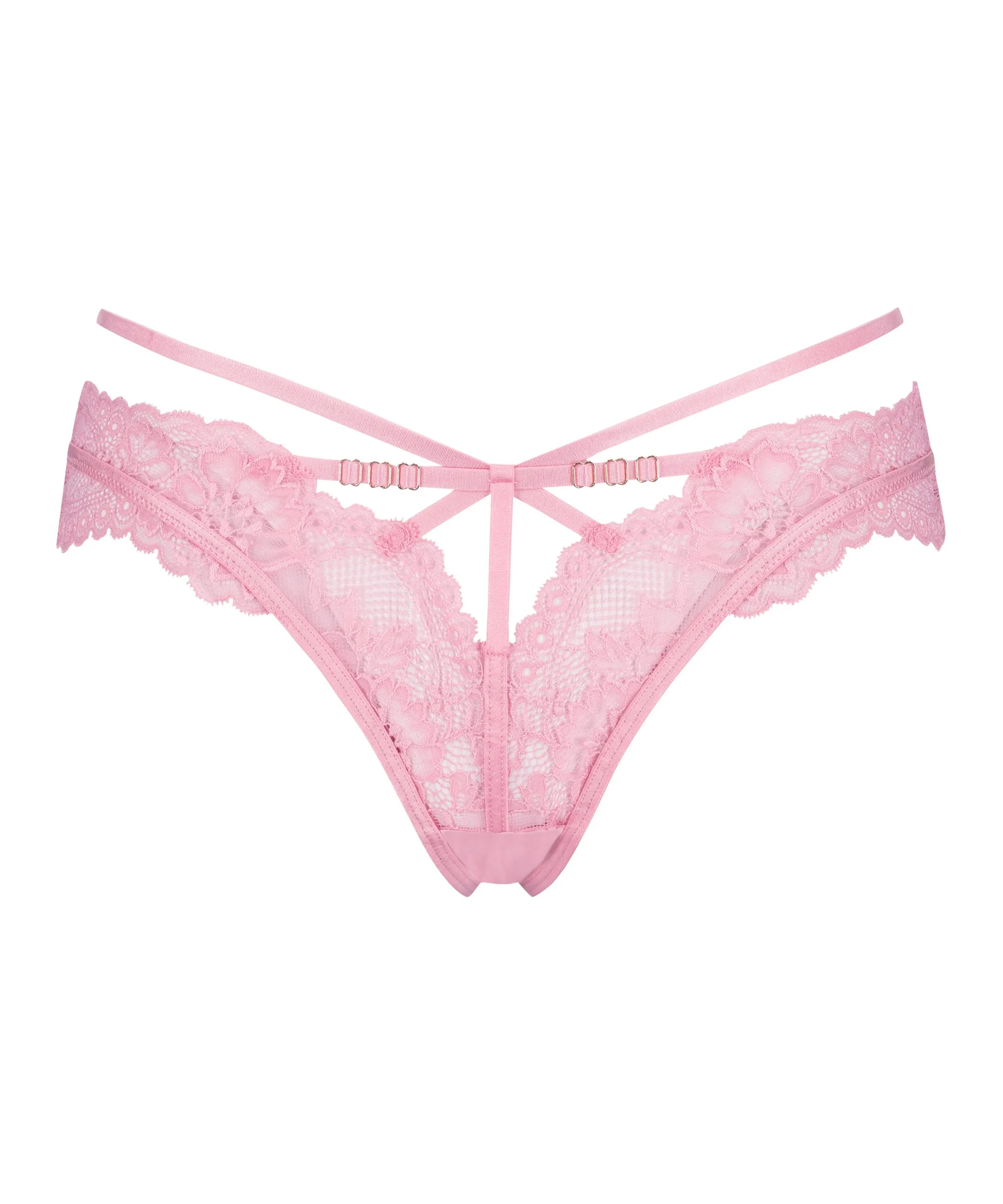 Lass dir diesen sexy String nicht entgehen! Er ist beidseitig komplett in Spitzenoptik gehalten mit vielen Riemchendetails und Goldelementen. Ergänze das Set mit einem passenden BH!
